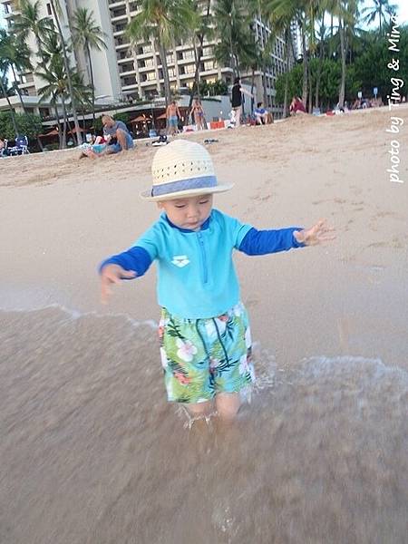 爸爸也帶著宬寶寶到比較深的地方玩水,不過這裡的海灘比較不像我們在茂宜島的海灘一樣,暗礁很多,也有很多的小石頭都非常的刺腳,所以帶孩子來這裡玩水,記得一定要穿鞋子下去踏浪。